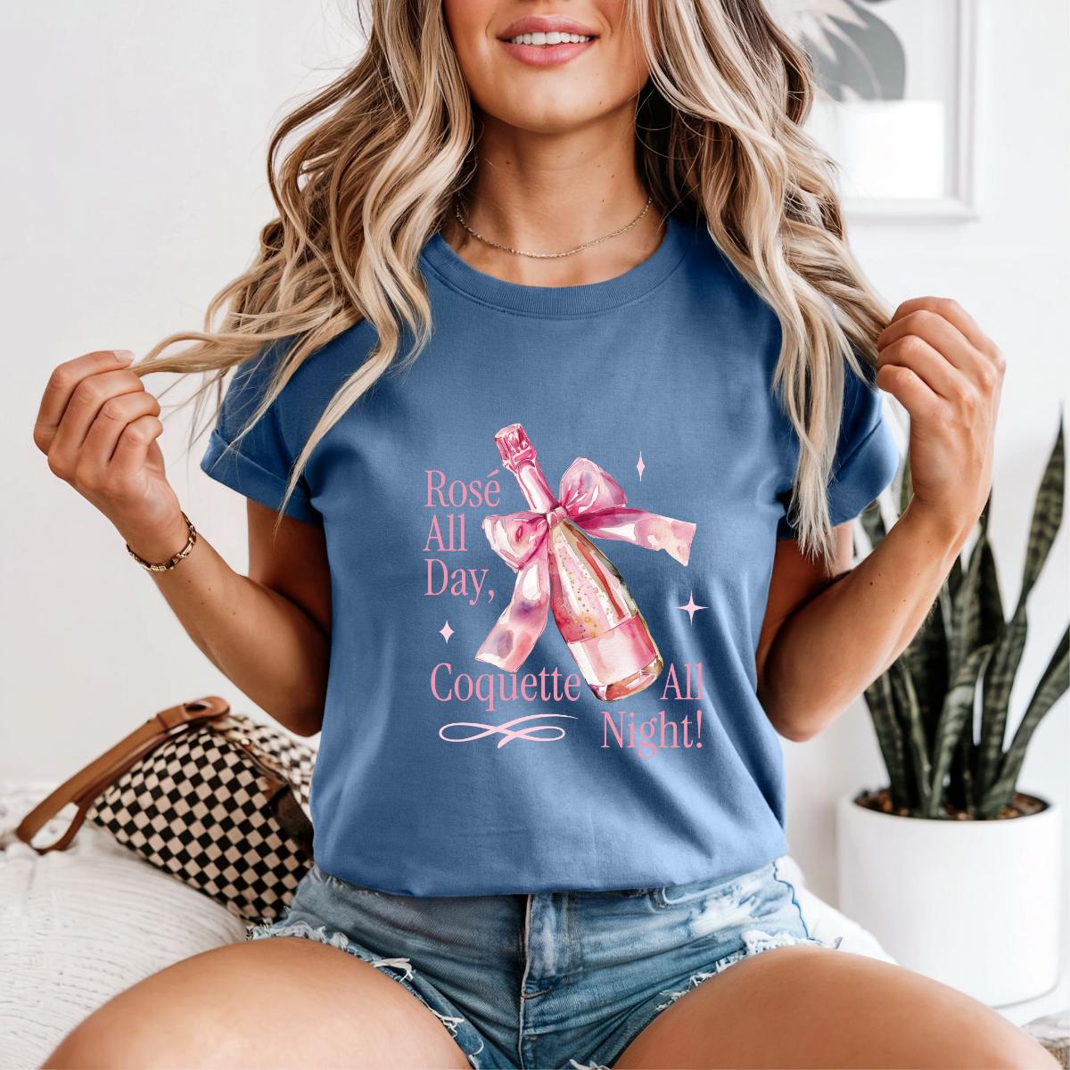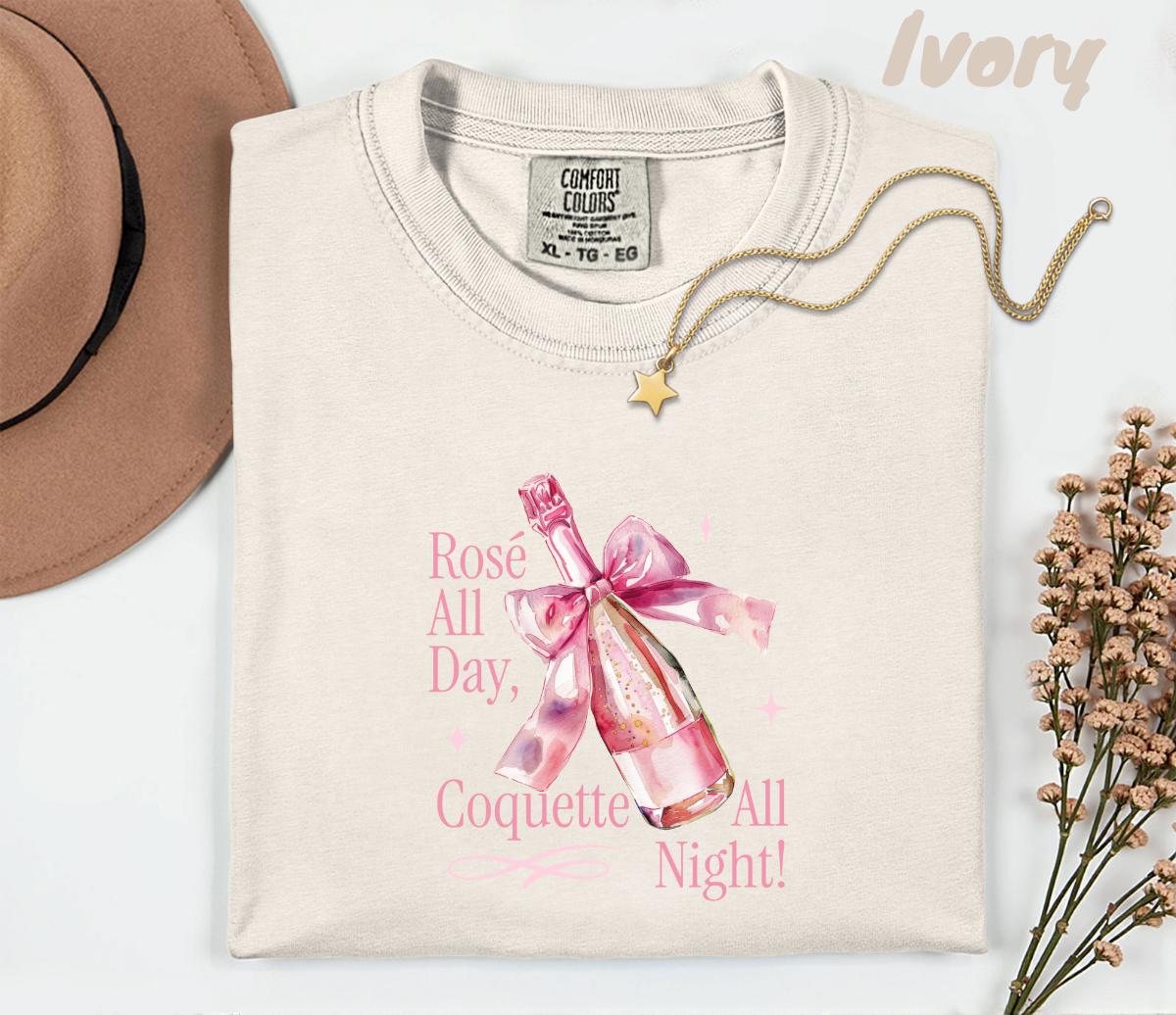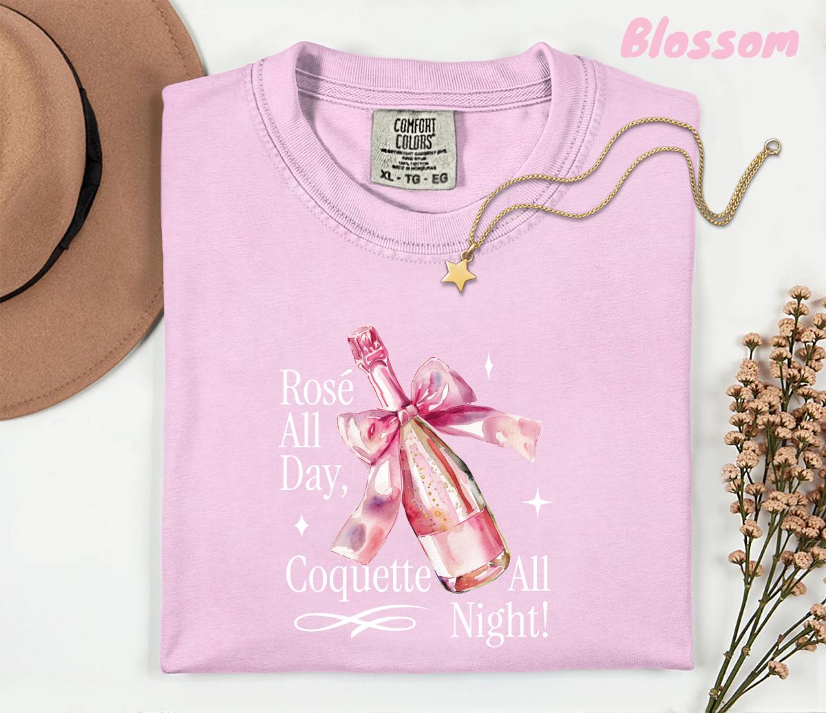 Step into your soft girl era with this Comfort Colors® 1717 Rosé All Day, Coquette All Night T-shirt, featuring a pink champagne bottle wrapped with a delicate bow. Perfect for girls’ nights, bachelorettes, brunch lovers, and anyone who adores coquette aesthetic vibes.
