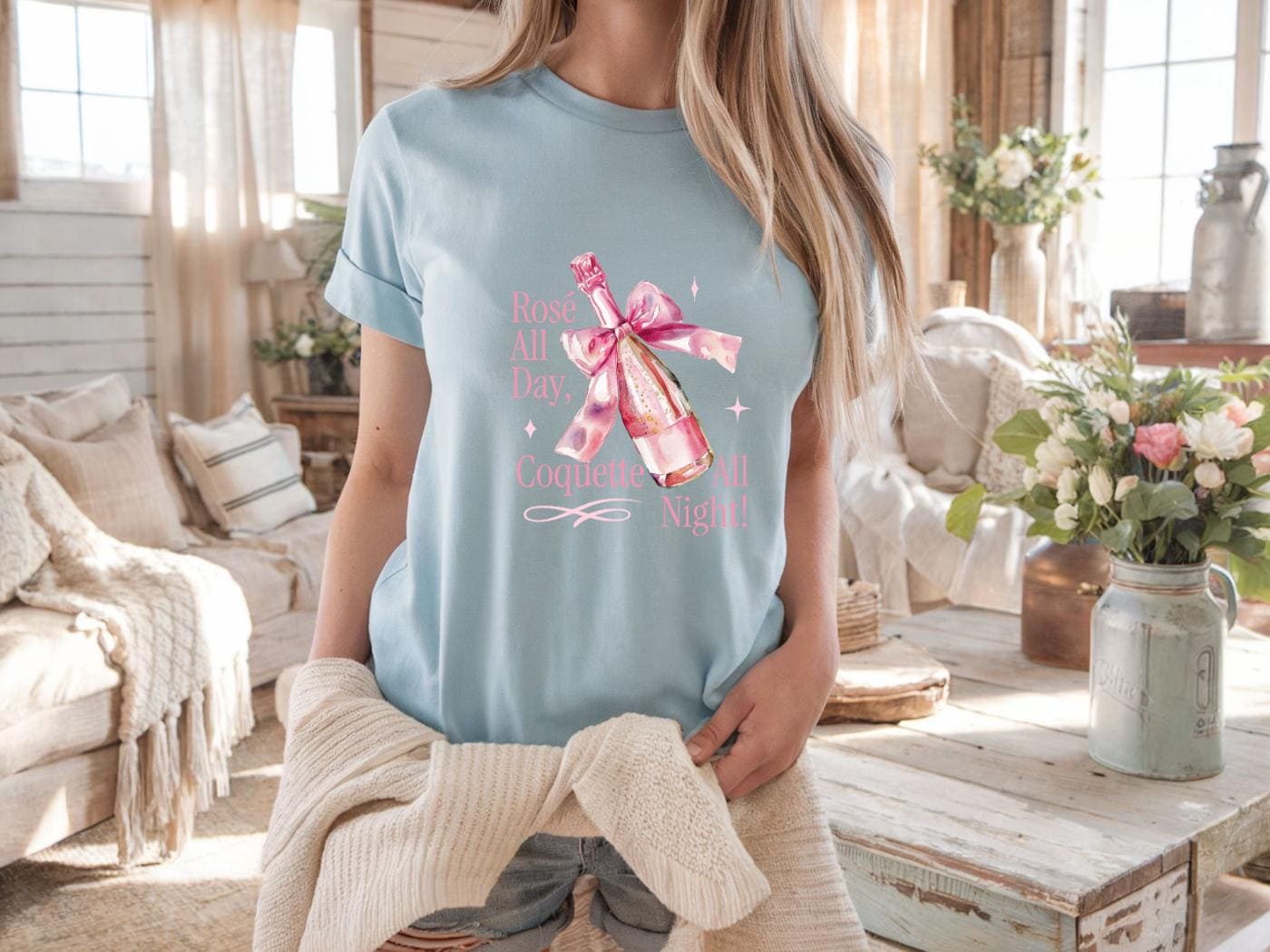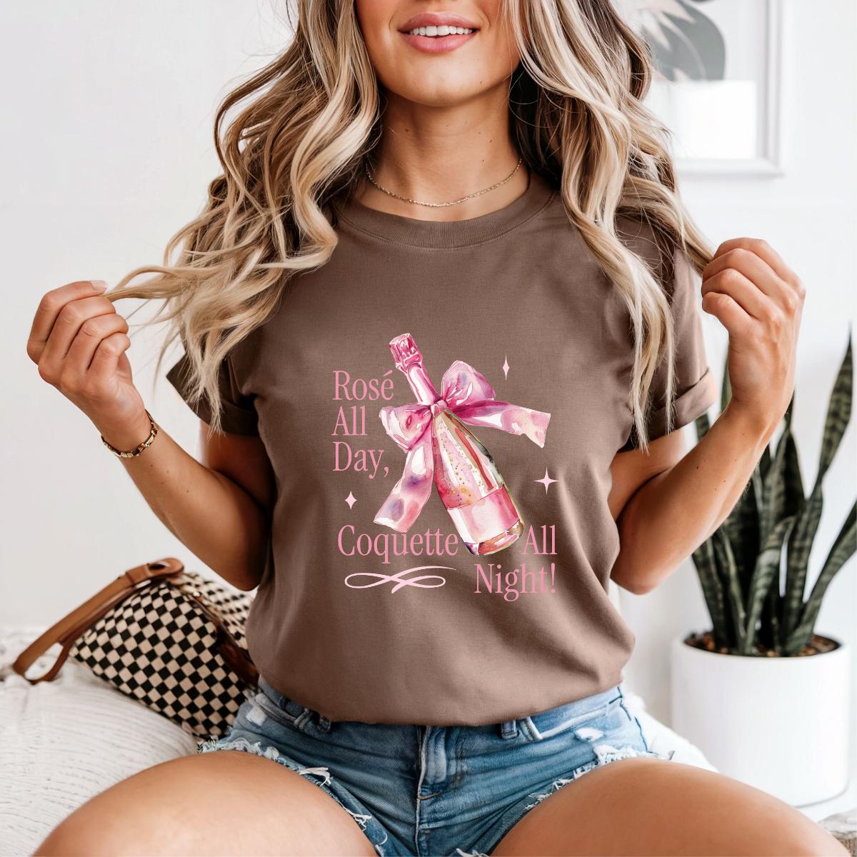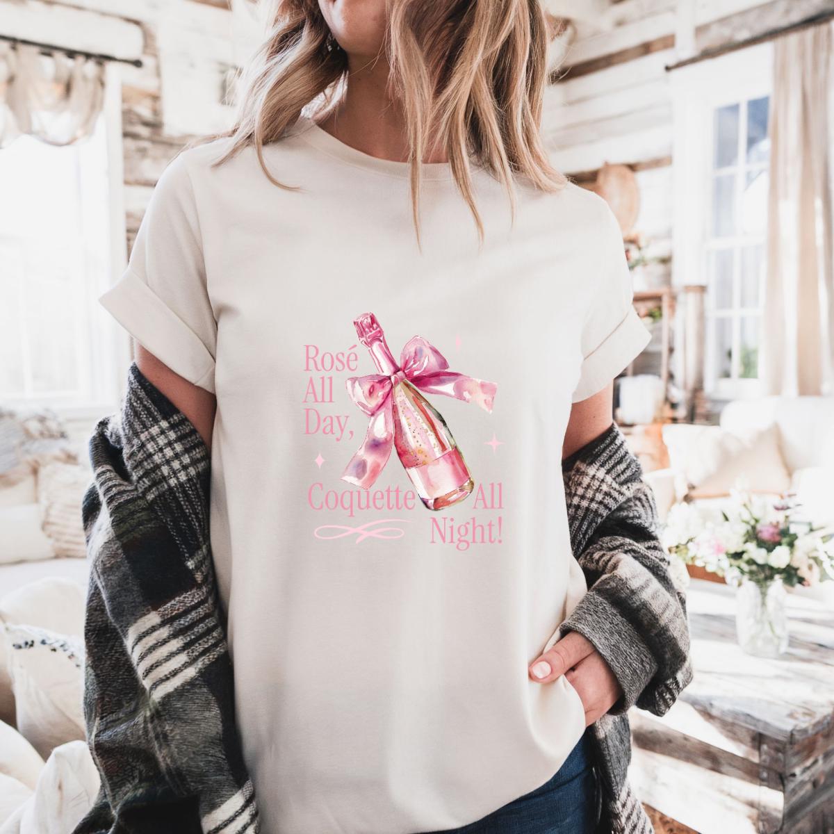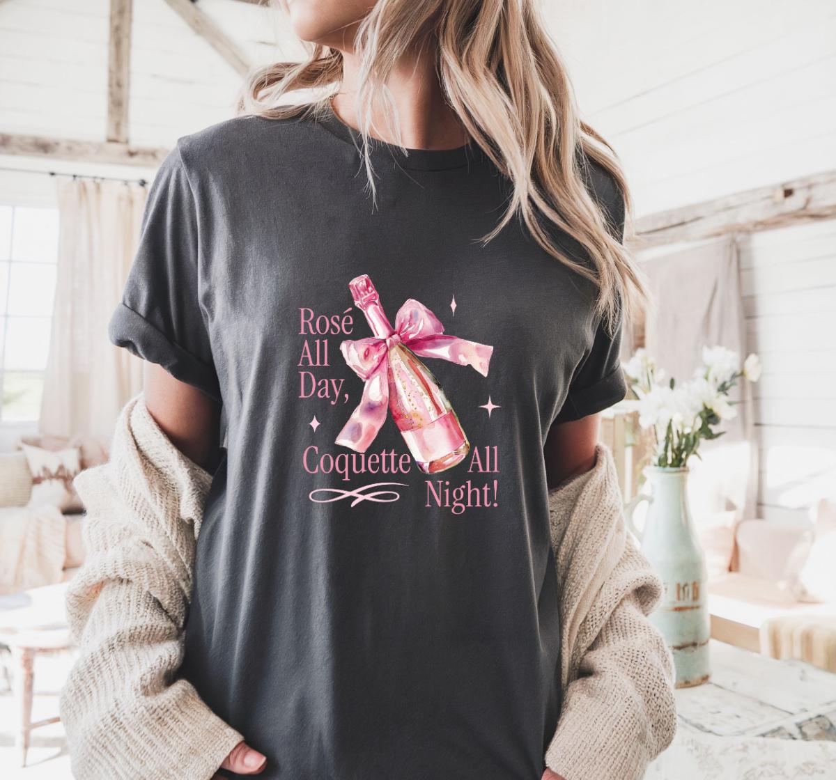 Step into your soft girl era with this Comfort Colors® 1717 Rosé All Day, Coquette All Night T-shirt, featuring a pink champagne bottle wrapped with a delicate bow. Perfect for girls’ nights, bachelorettes, brunch lovers, and anyone who adores coquette aesthetic vibes.