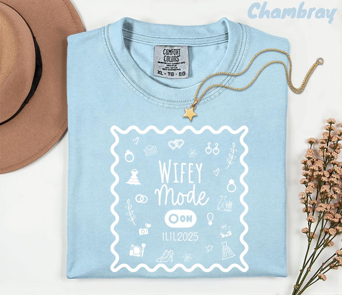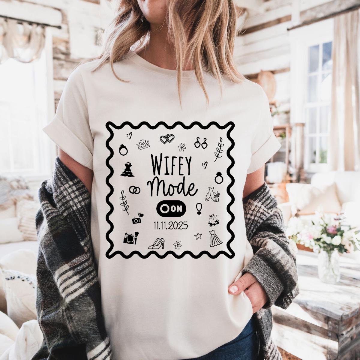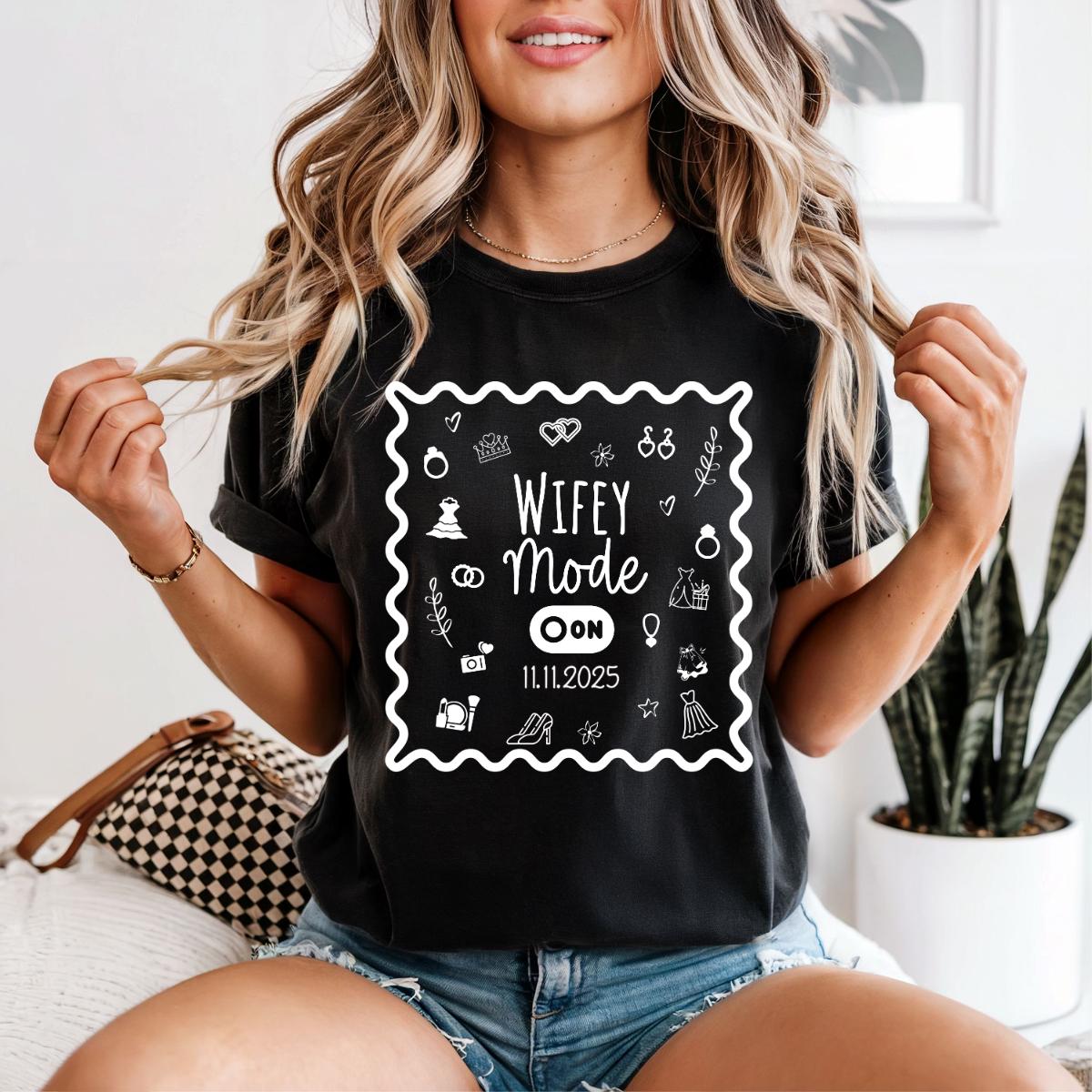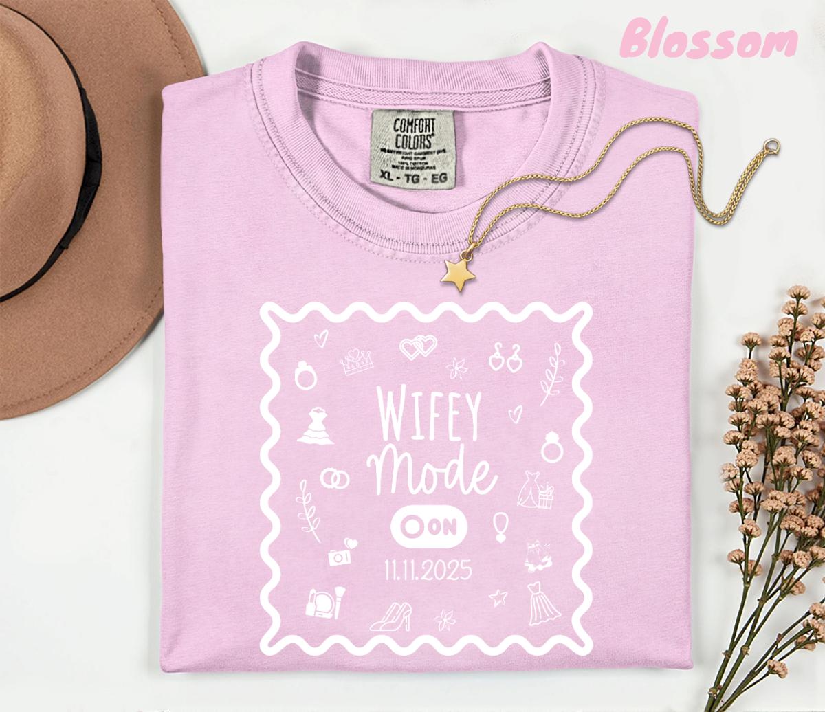 Celebrate your big day in style with this Wifey Mode On Comfort Colors® tee — now fully customizable with your own wedding date! Featuring a romantic hand-drawn bridal frame, this ultra-soft vintage tee is perfect for brides who want a meaningful and stylish keepsake.