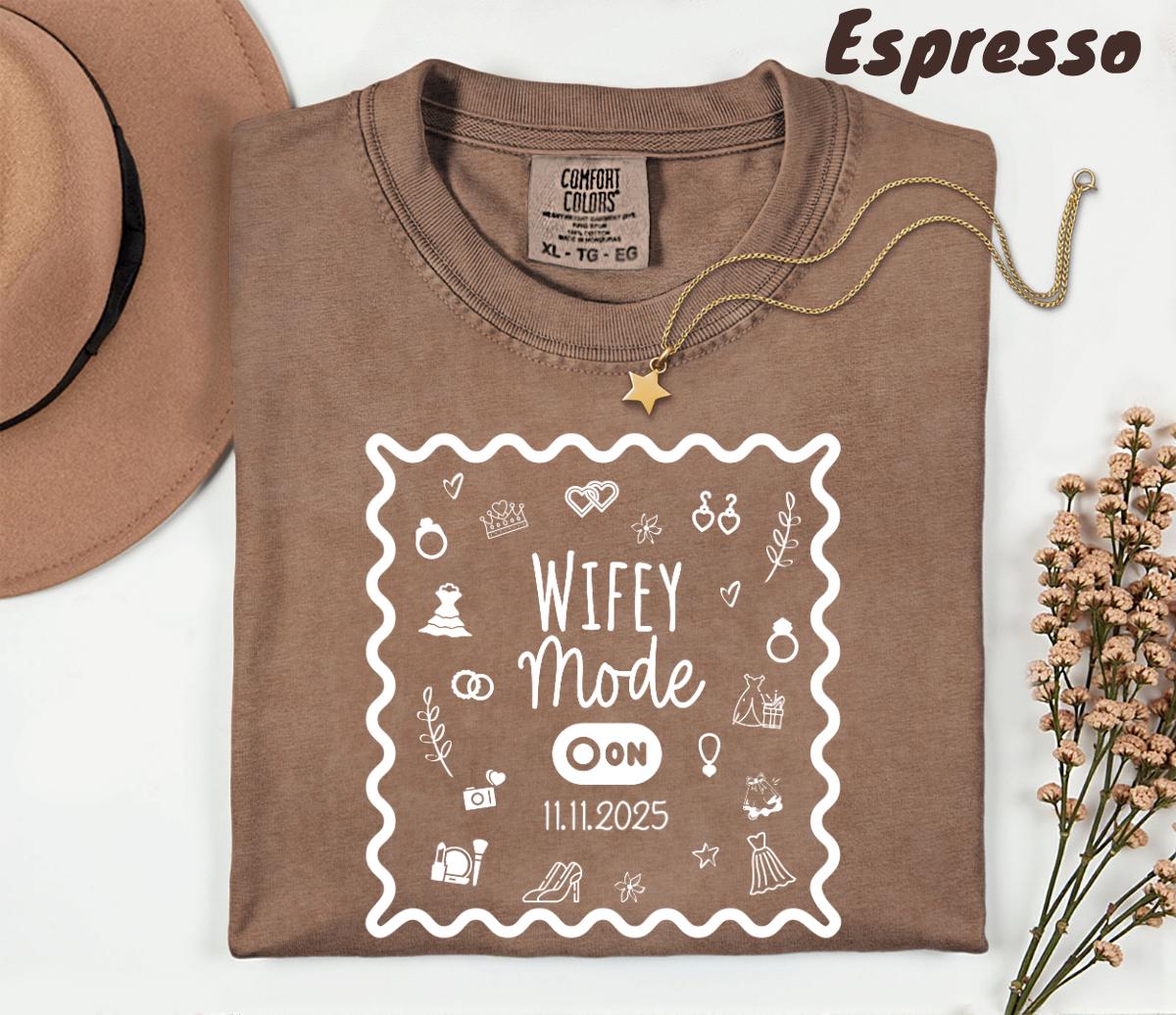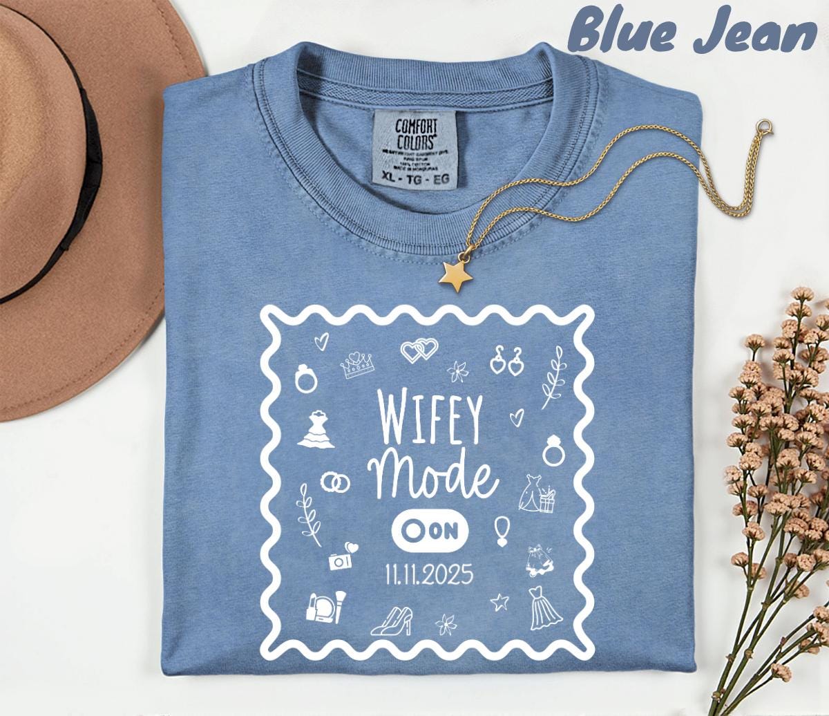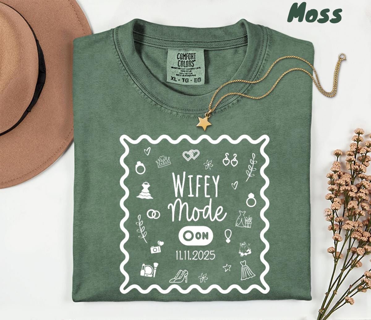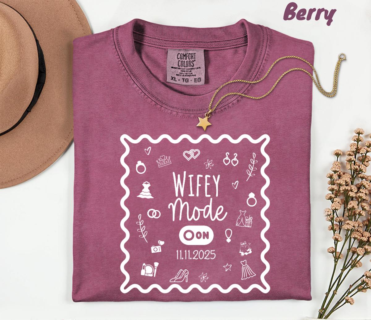 Celebrate your big day in style with this Wifey Mode On Comfort Colors® tee — now fully customizable with your own wedding date! Featuring a romantic hand-drawn bridal frame, this ultra-soft vintage tee is perfect for brides who want a meaningful and stylish keepsake.