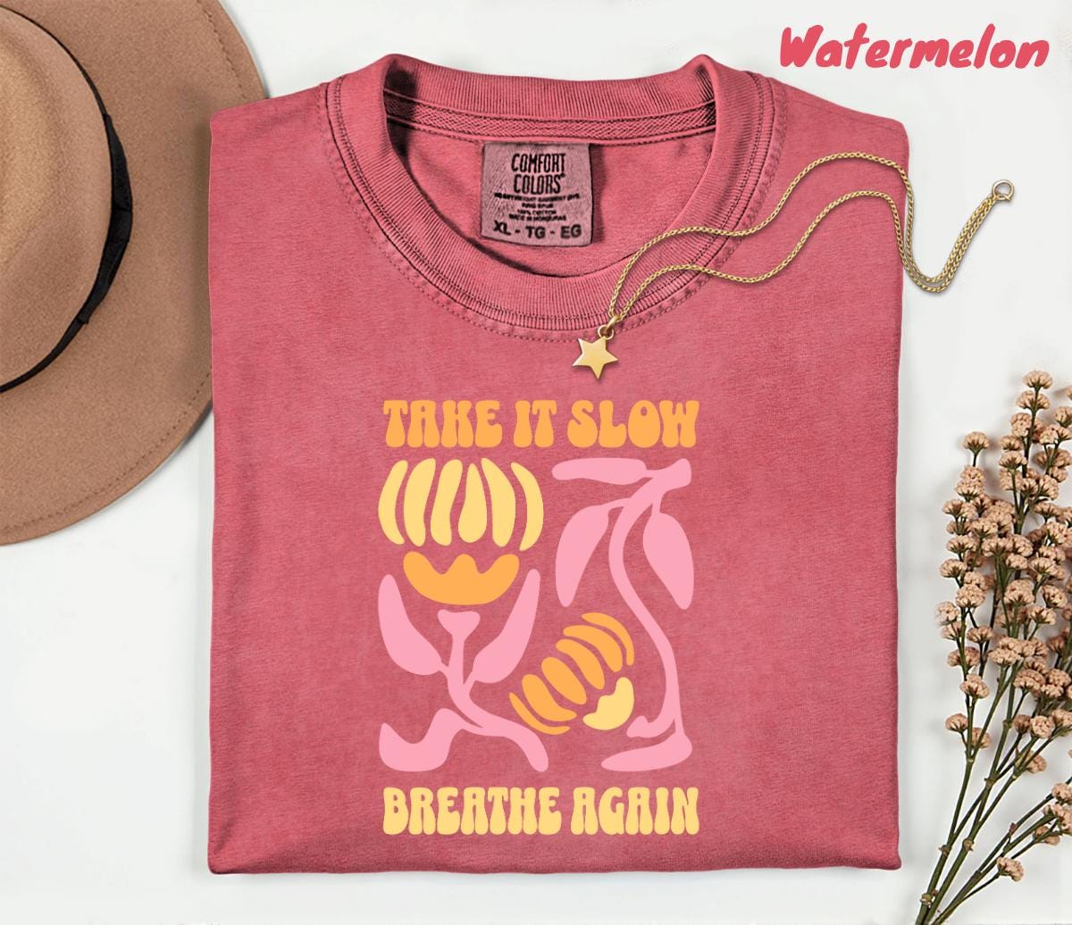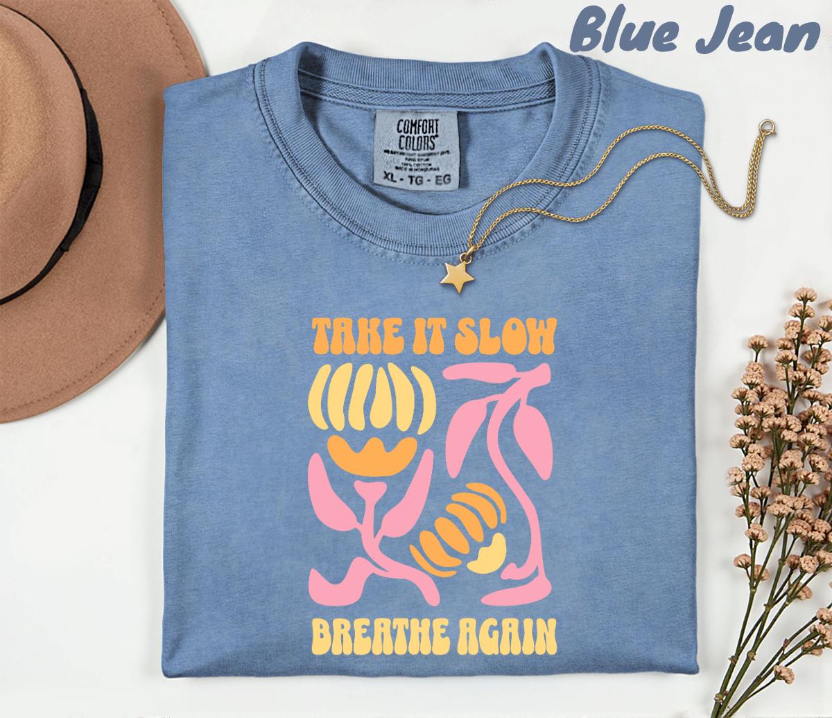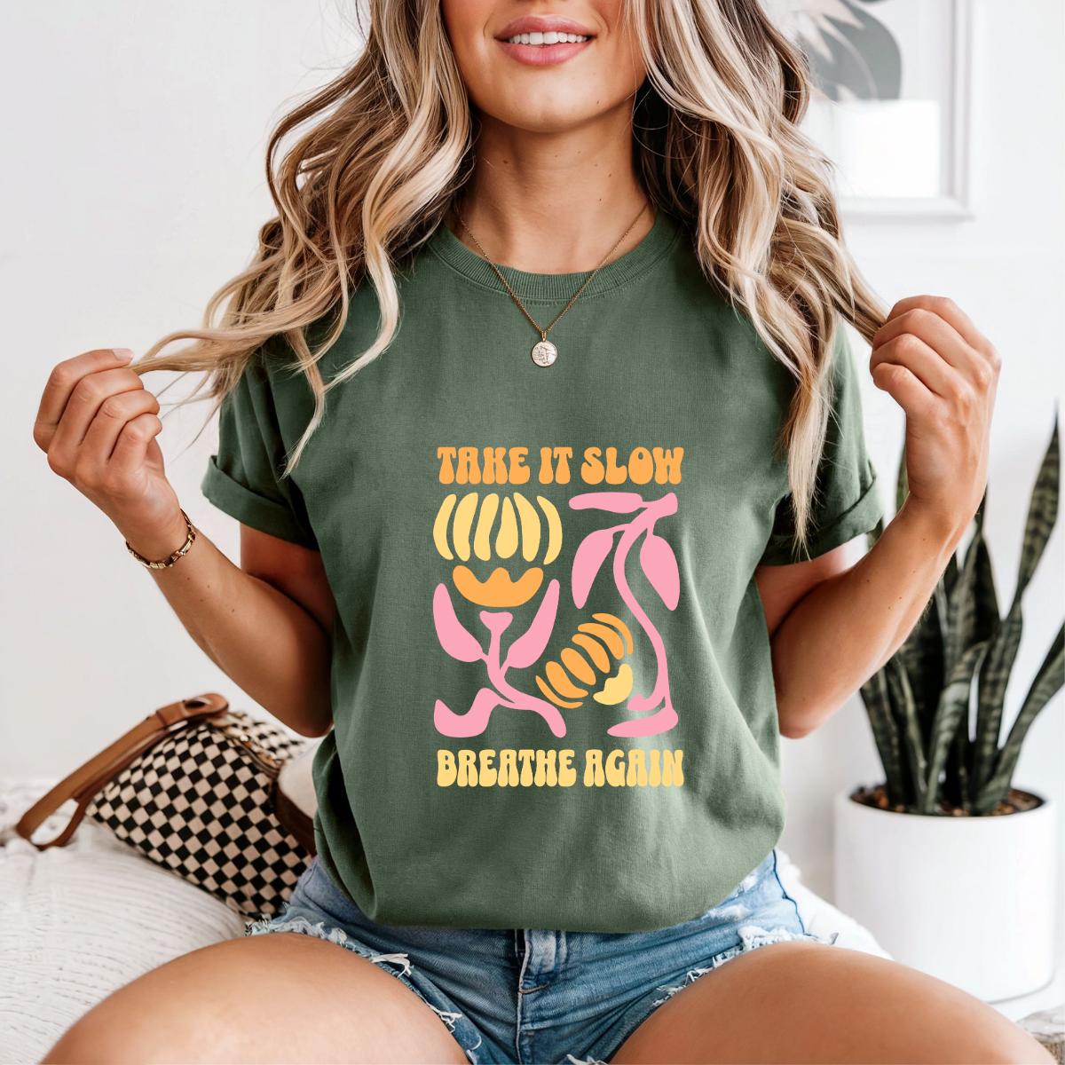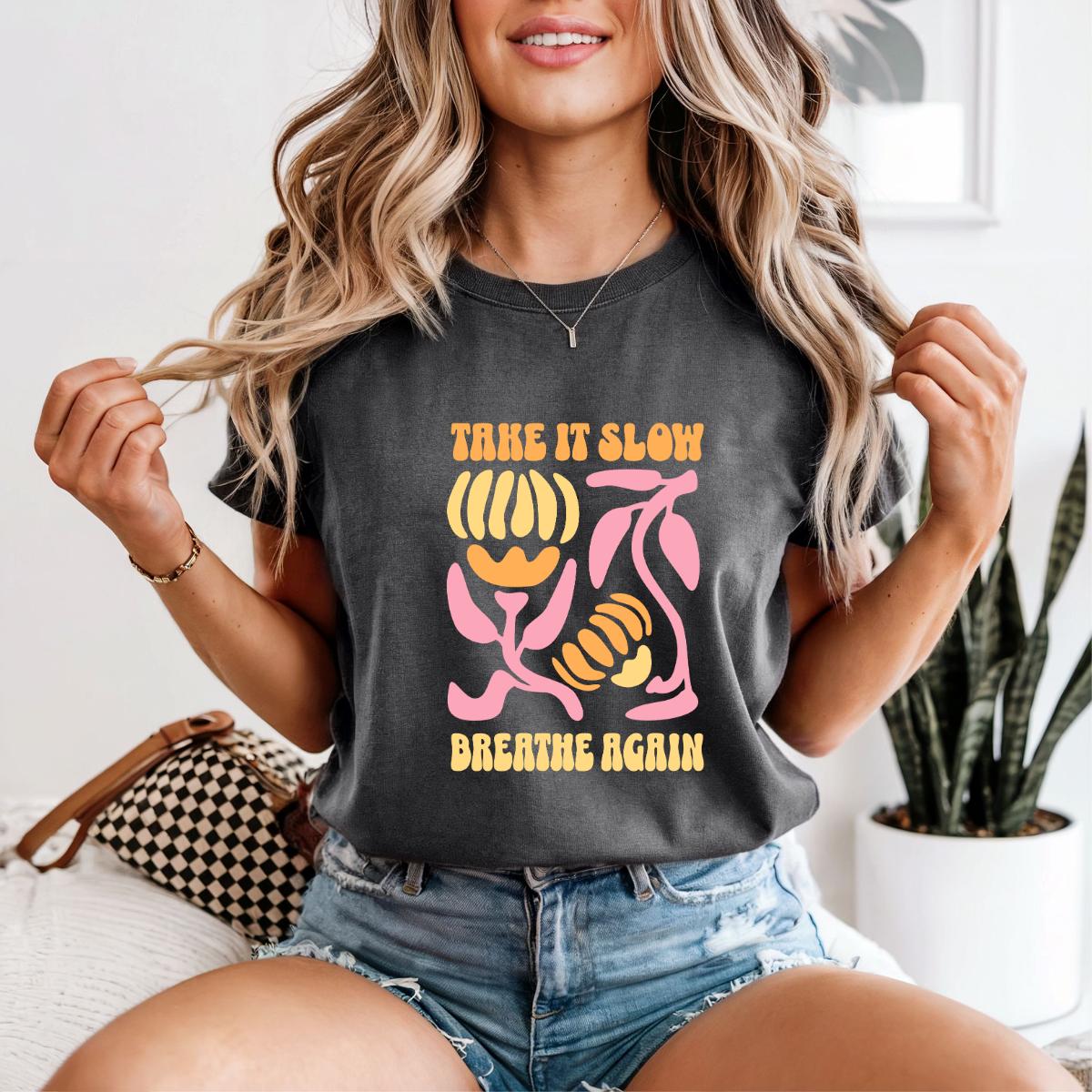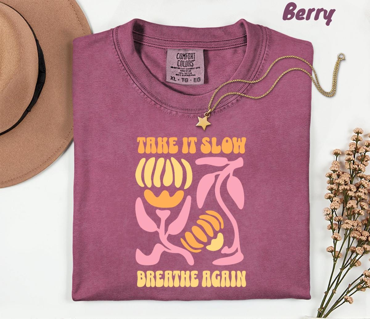 Find your calm in style with this Take It Slow, Breathe Again Comfort Colors® tee. Featuring a soft retro floral design in warm pastel yellow and pink, this groovy graphic tee brings a peaceful vibe to your wardrobe. Printed on vintage-washed Comfort Colors® cotton, it’s the perfect combination of comfort, softness, and inspirational design.
