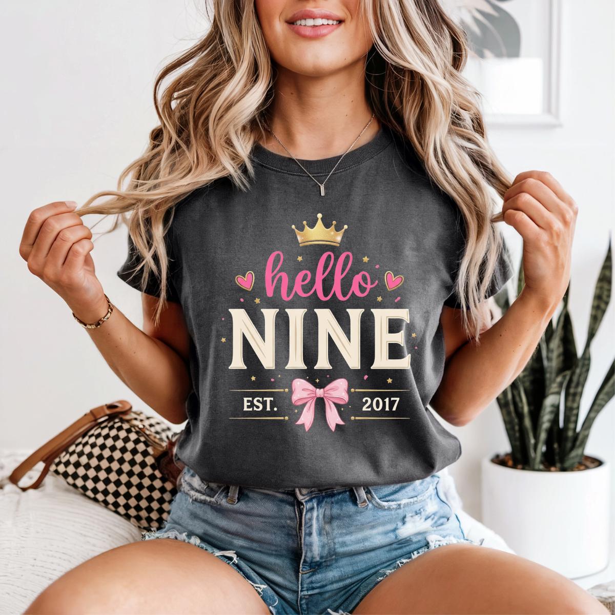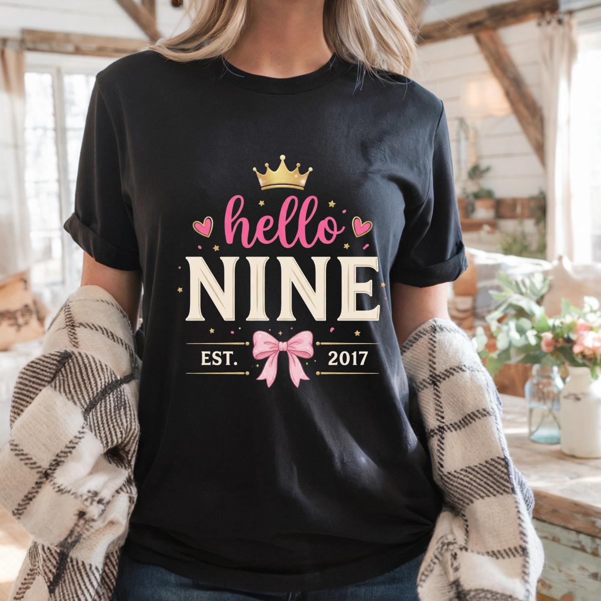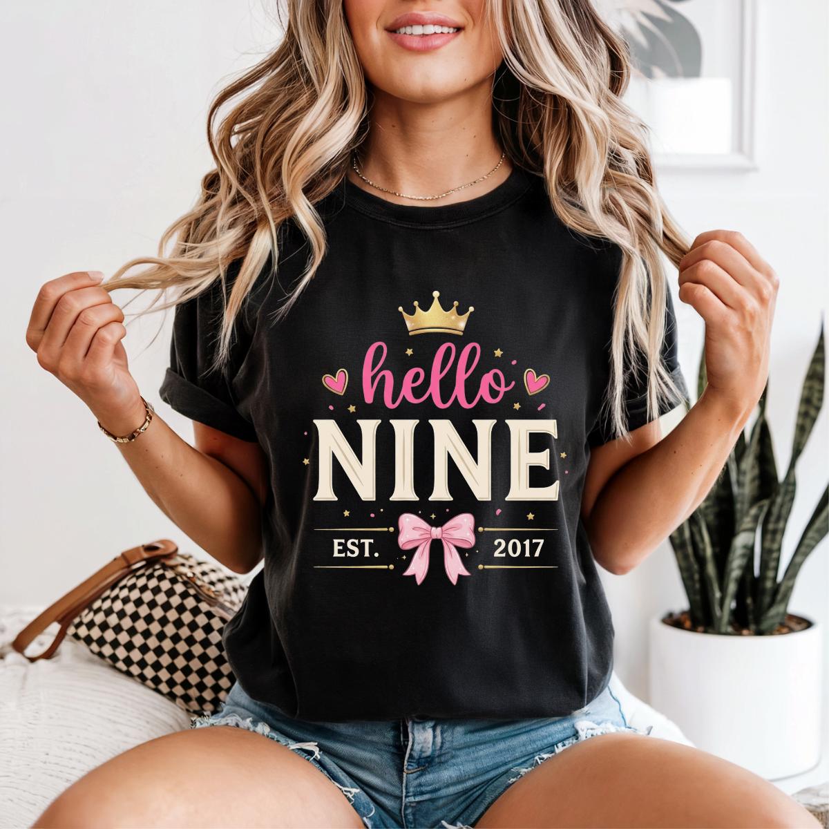 Hello Nine Est 2017 Cute Bow 9th Birthday Girl T-Shirt, 9 Years Old Girl Gift, Cute Birthday Graphic Tee