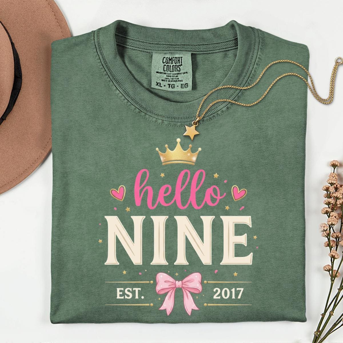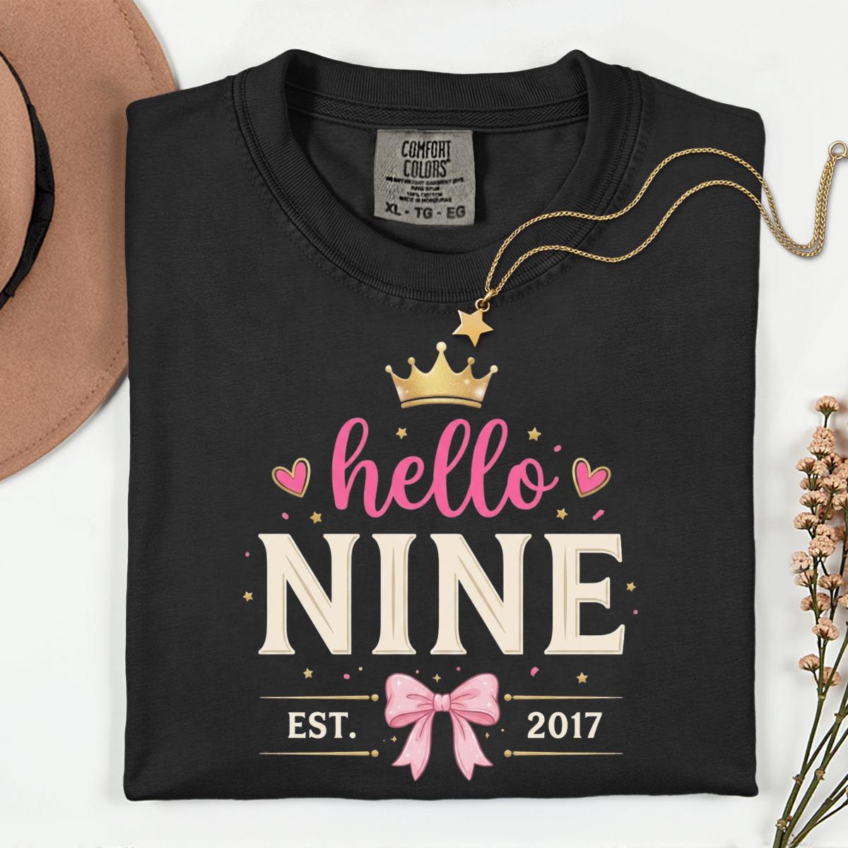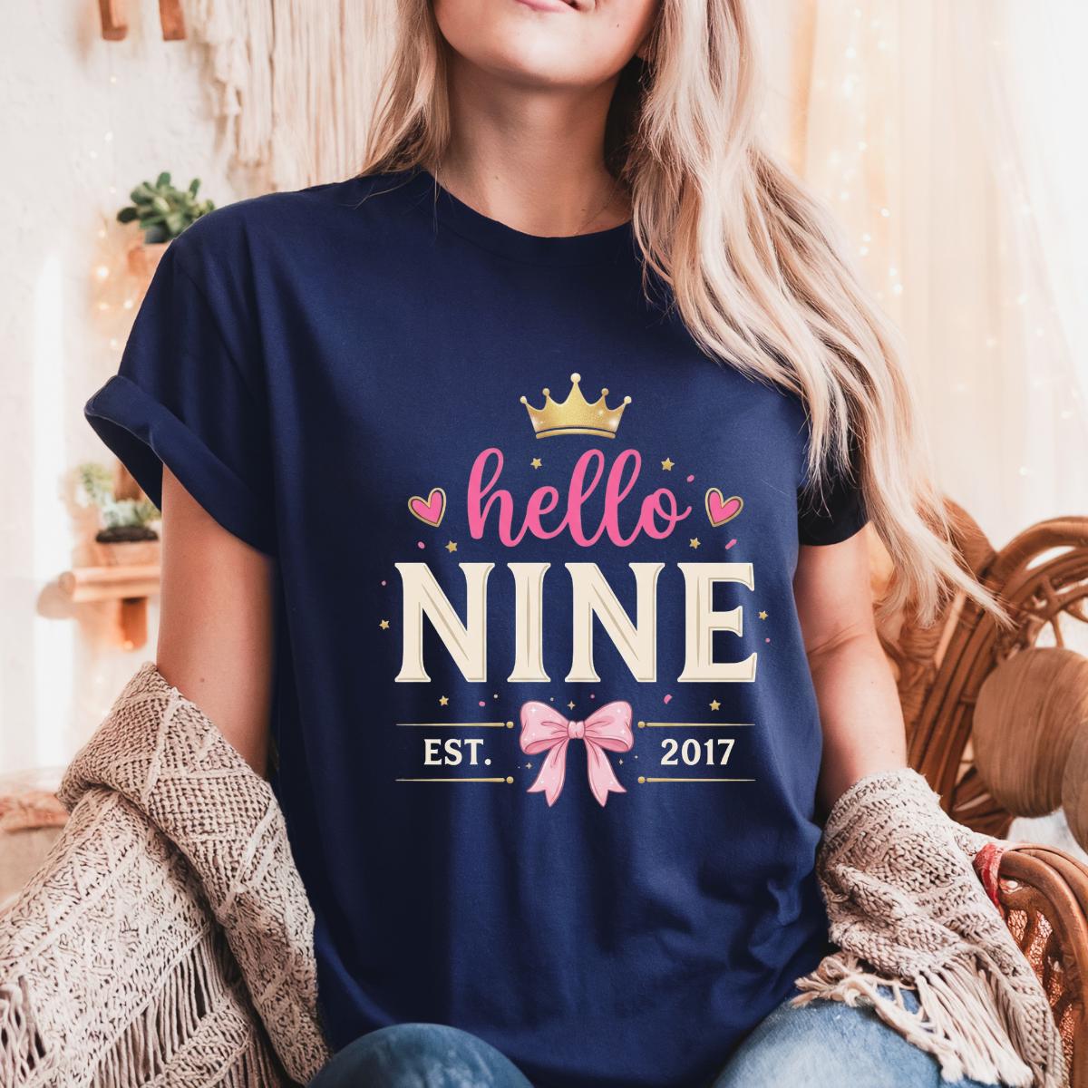 Hello Nine Est 2017 Cute Bow 9th Birthday Girl T-Shirt, 9 Years Old Girl Gift, Cute Birthday Graphic Tee