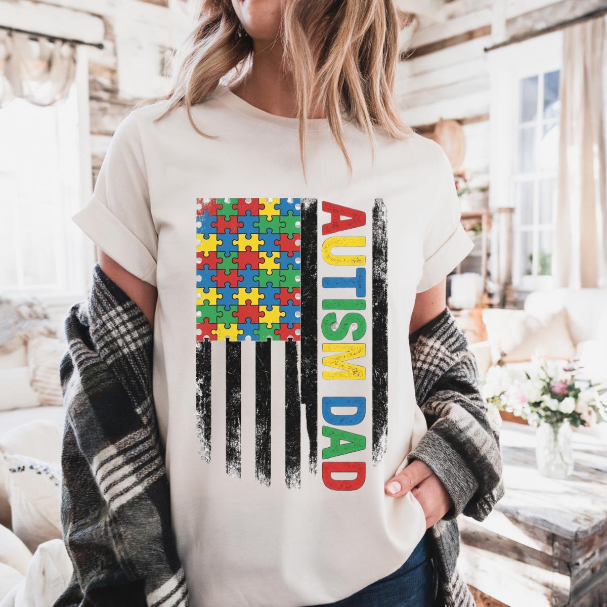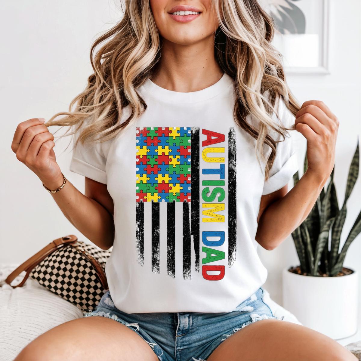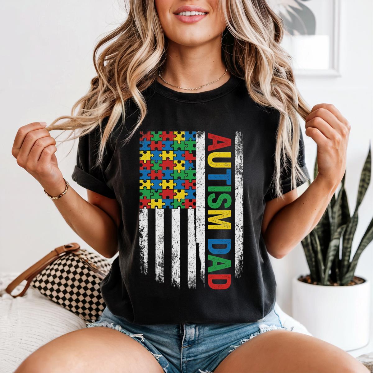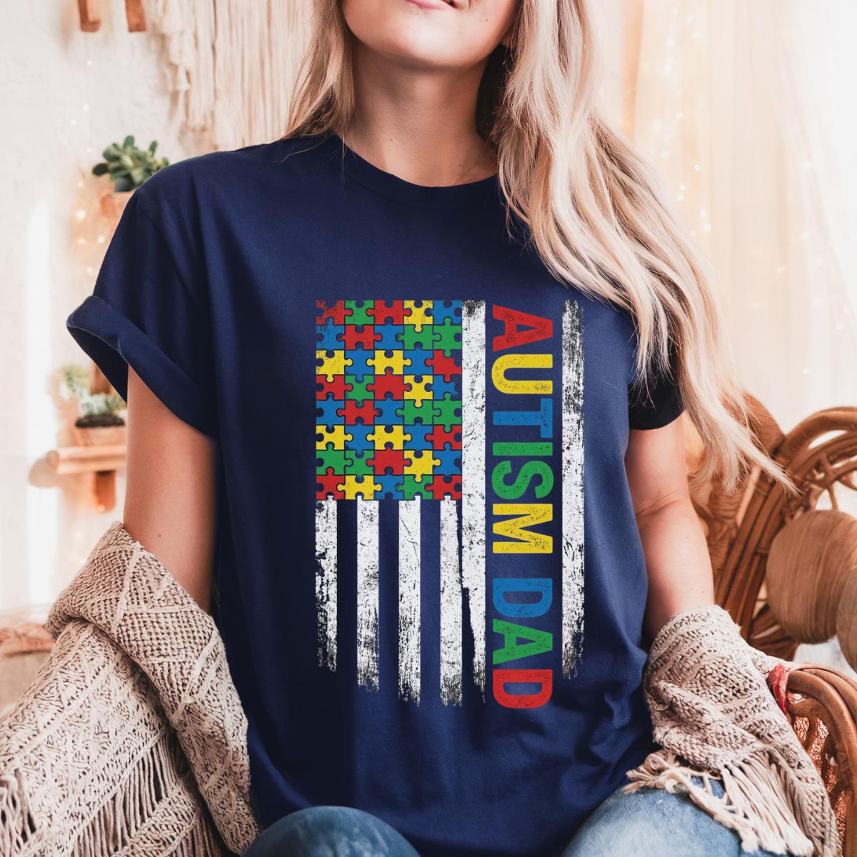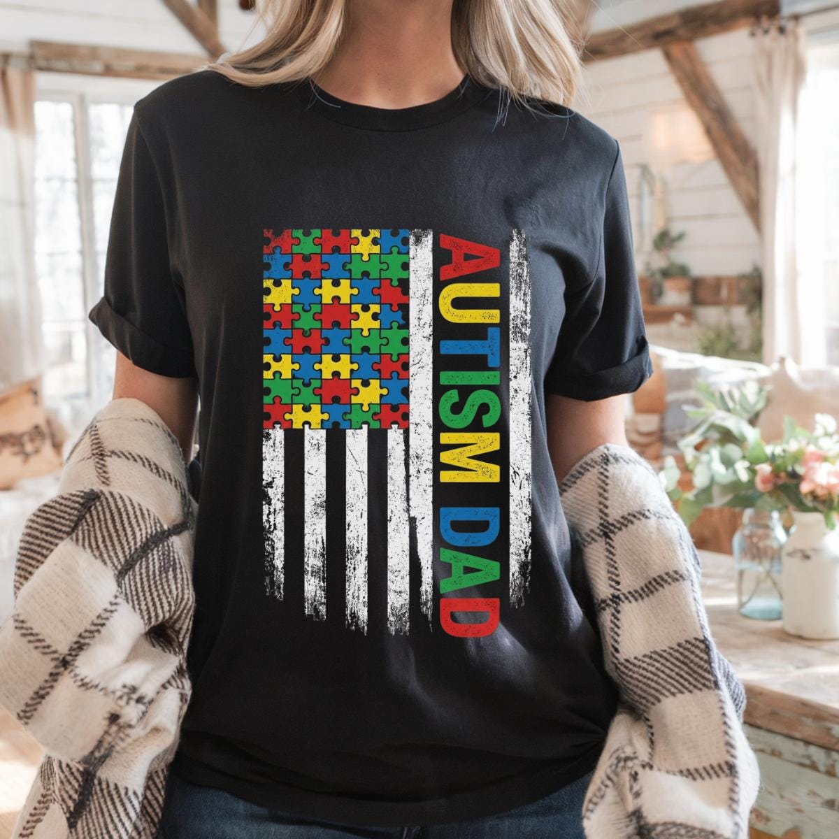 Autism Dad Father Autism Awareness Puzzle Pieces USA Flag T-Shirt, Autism Dad Gift, Autism Awareness Graphic Tee