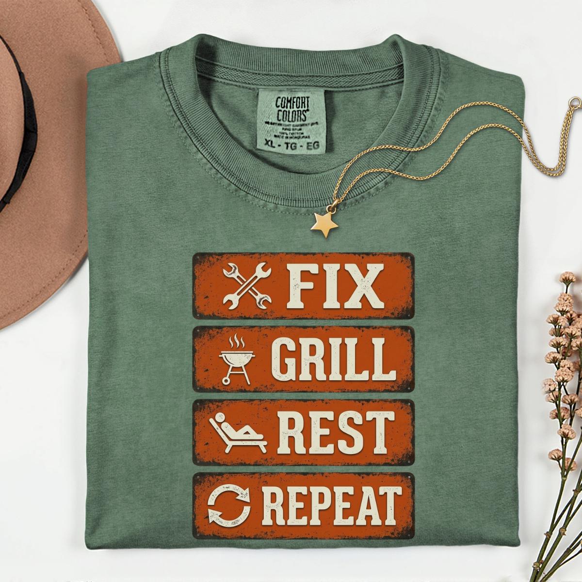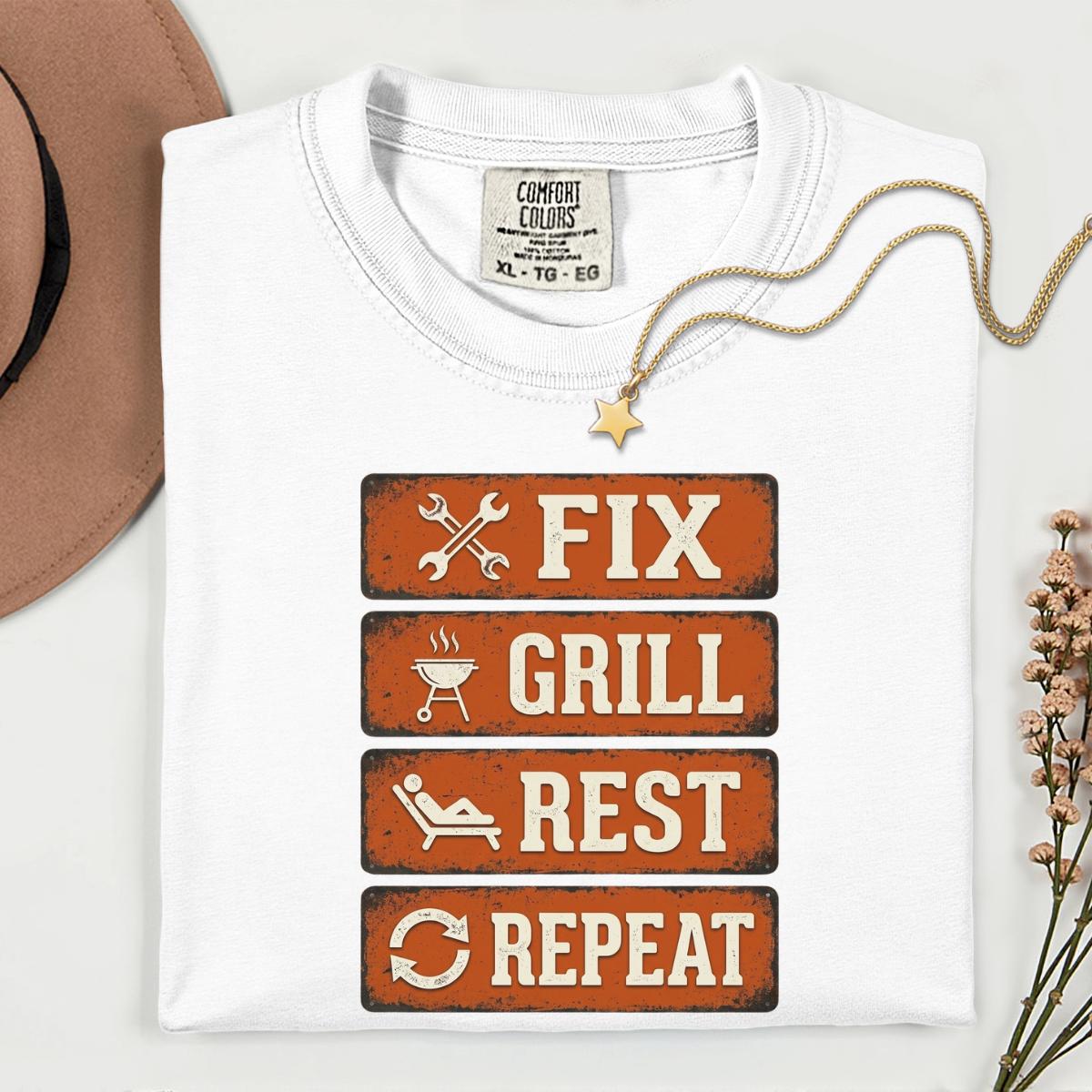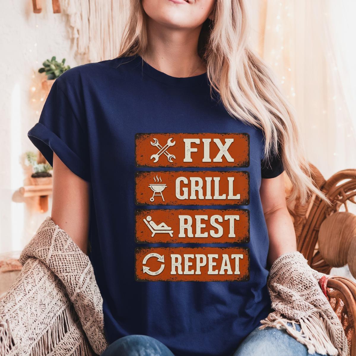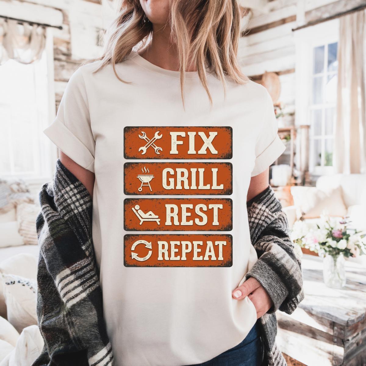 Dad Fix Grill Rest Repeat T-Shirt, Funny BBQ Dad Gift, Fathers Day Grill Master Graphic Tee