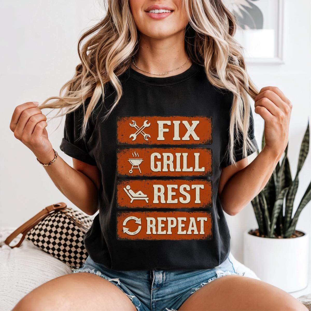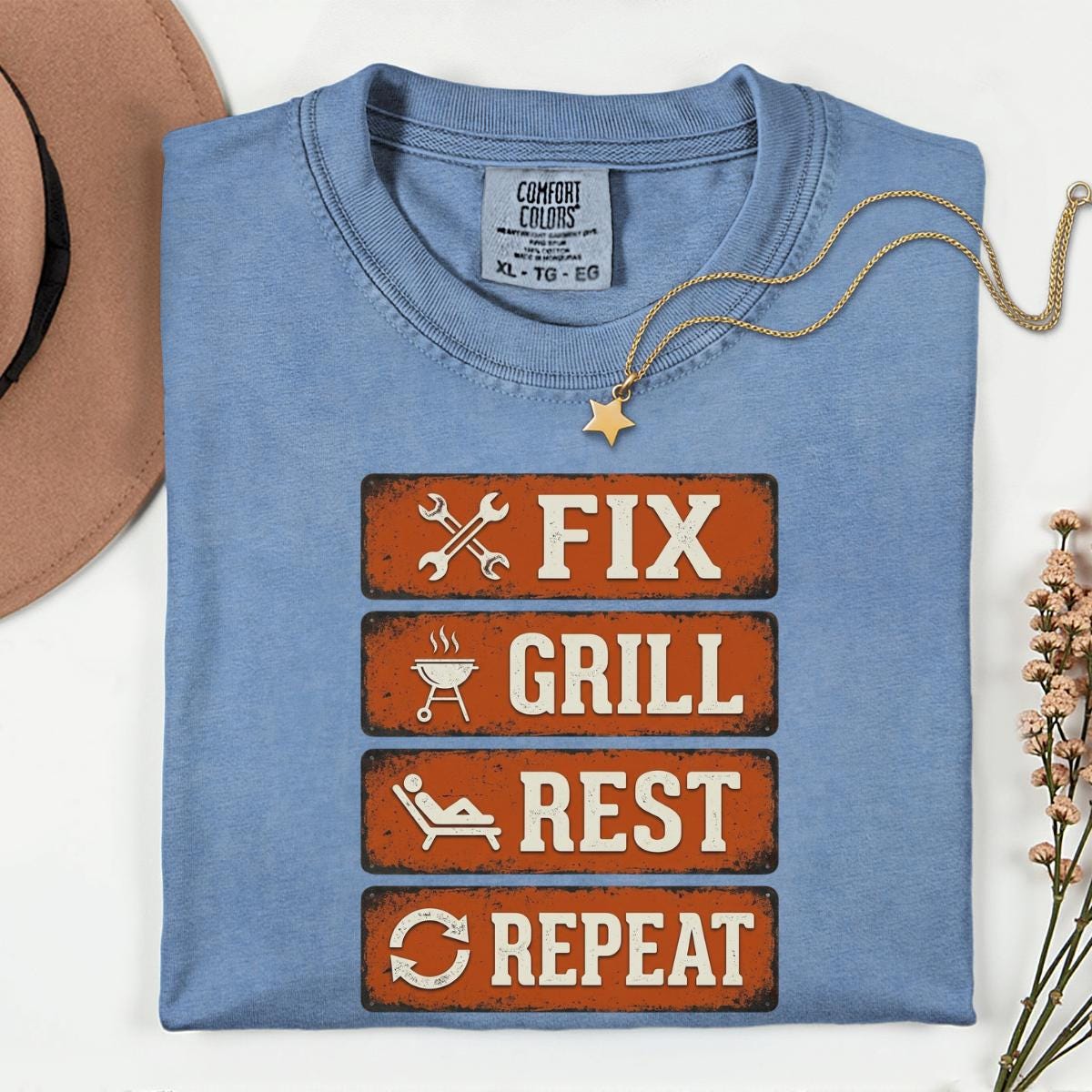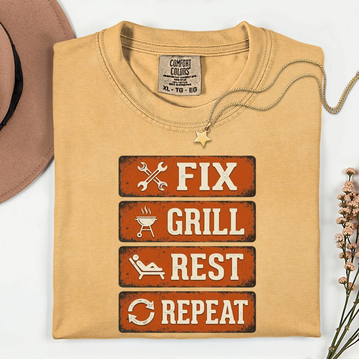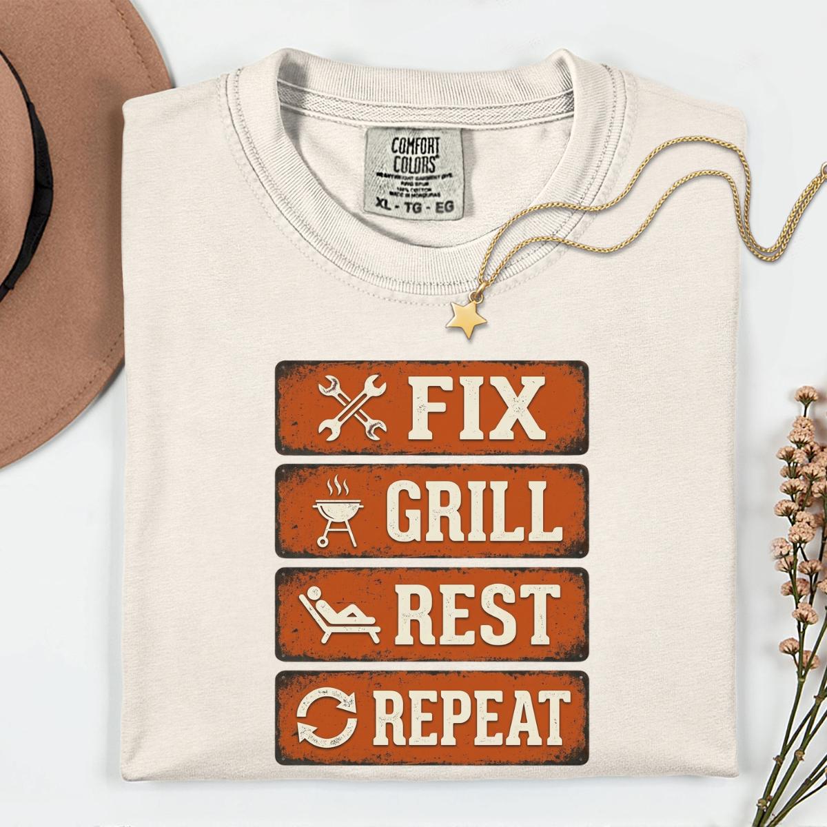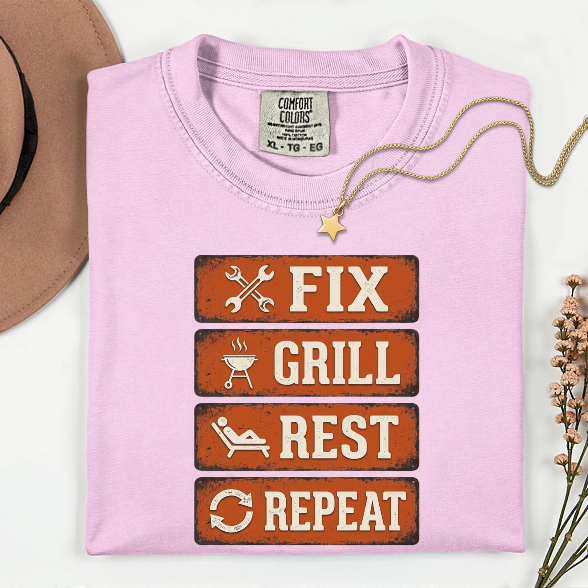 Dad Fix Grill Rest Repeat T-Shirt, Funny BBQ Dad Gift, Fathers Day Grill Master Graphic Tee